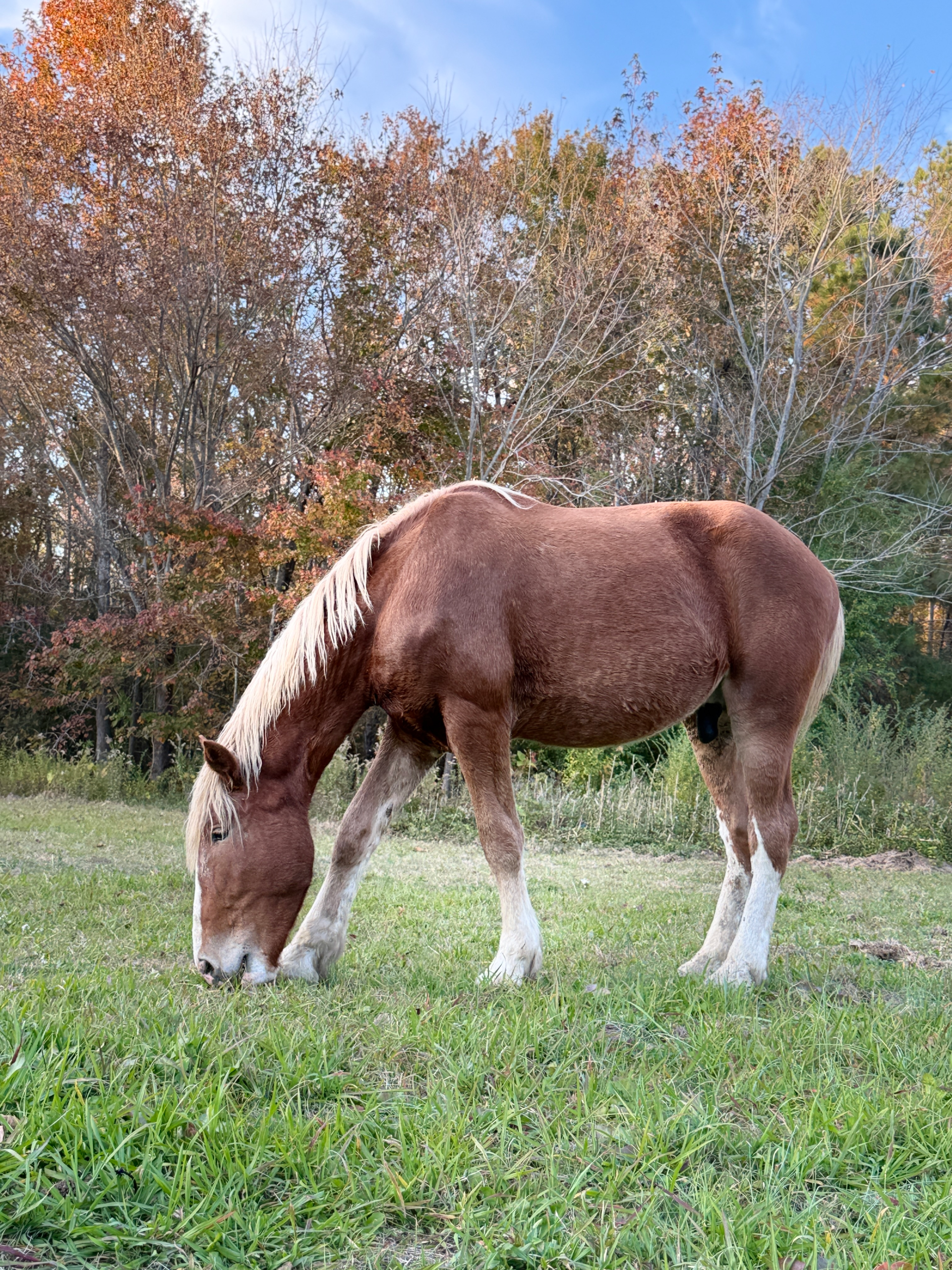 We took Brutus to get his surgery done at VA tech in Leesburg, VA. The wonderful team there informed us that the mass was not cancer but a really bad cyst blocking 80% of his airway. They successfully removed the mass and gave us medication for his pneumonia. 6 months later, here is what Baby Brutus looks like! You can see how he has filled out. Now he gets to live the rest of his life at Bluey’s with brothers and sisters and will never have to pull a cart ever again!